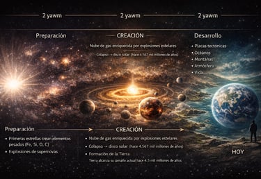 Piensa en construir una casa: primero necesitas terreno, materiales, cimientos. Luego construyes la estructura física. Después instalas electricidad, pintura, muebles. La Tierra siguió exactamente este patrón en tres fases:
