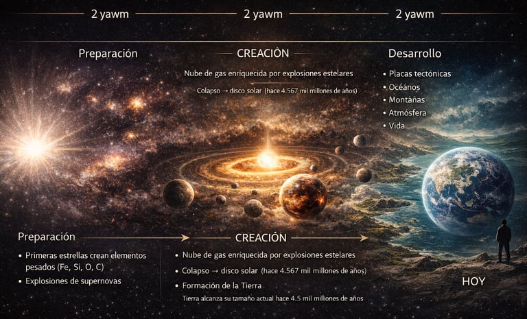 Yawm 5-6: La Tierra desarrolla geología (placas tectónicas, océanos, montañas, atmósfera, vida)